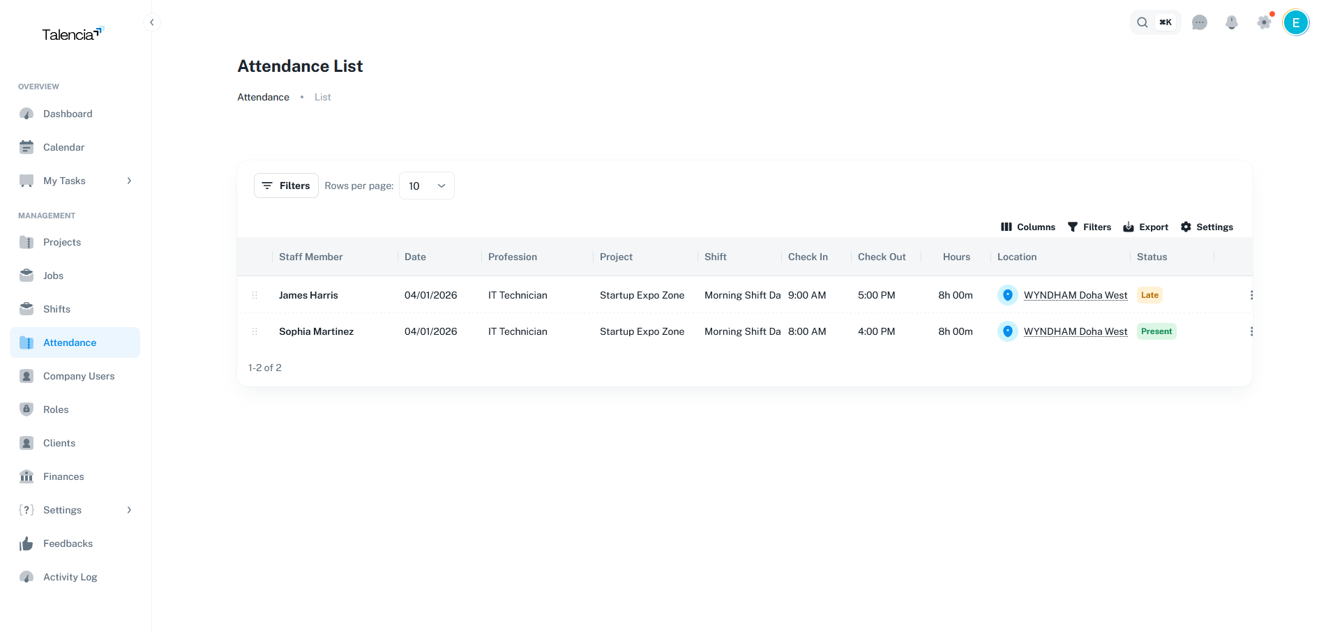 The attendance table provides a comprehensive view of all recorded attendance entries, with filtering, sorting, and export capabilities.
